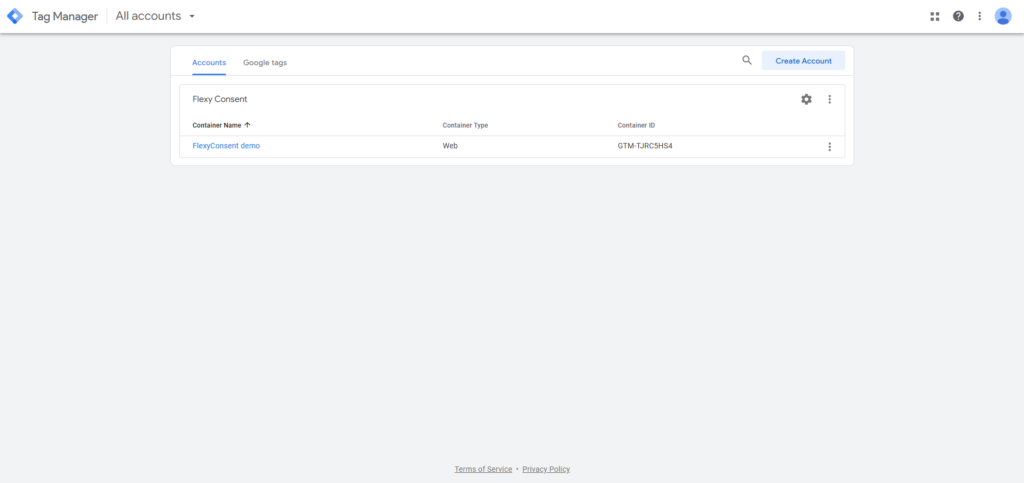 Select the container for the website where you want to add the JS code. (FlexyConsent demo for this guide)