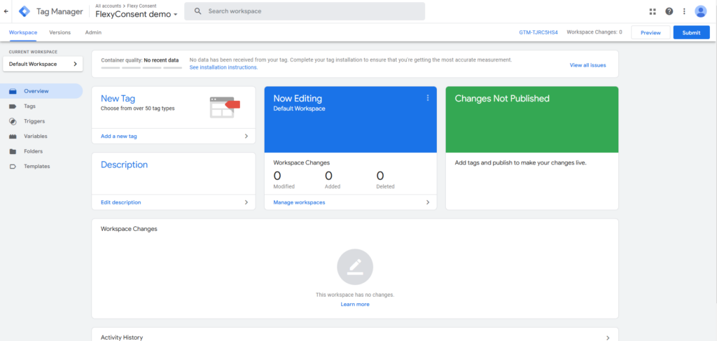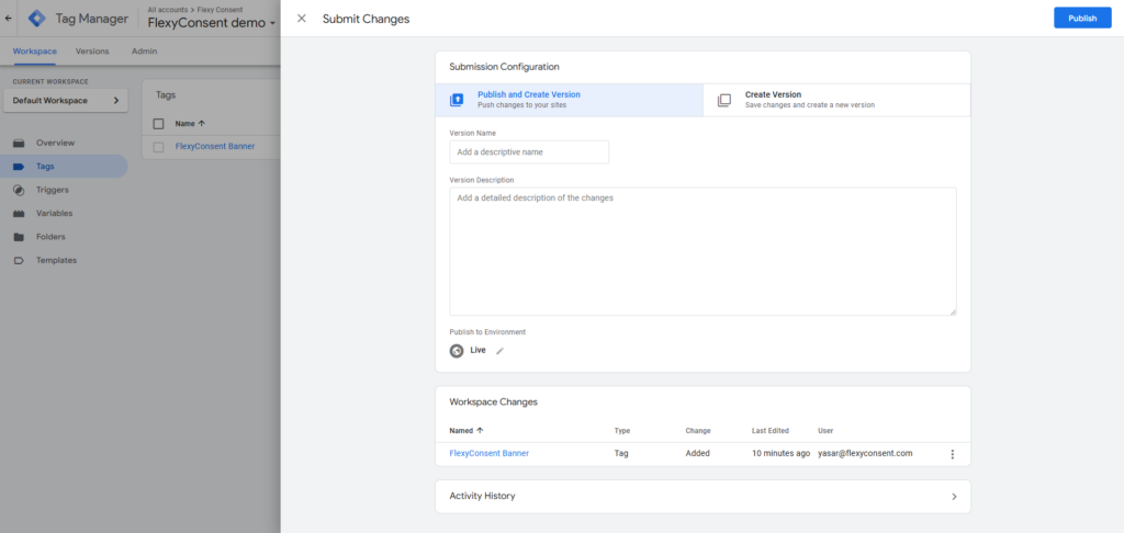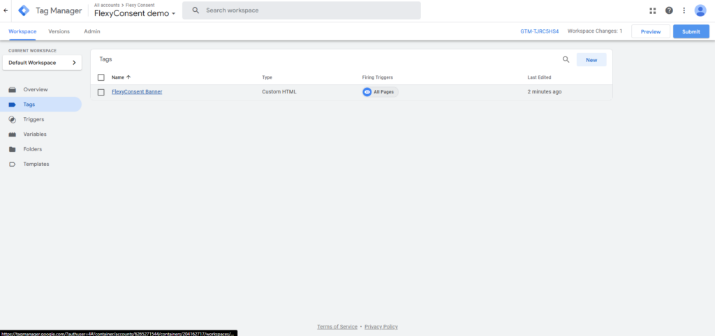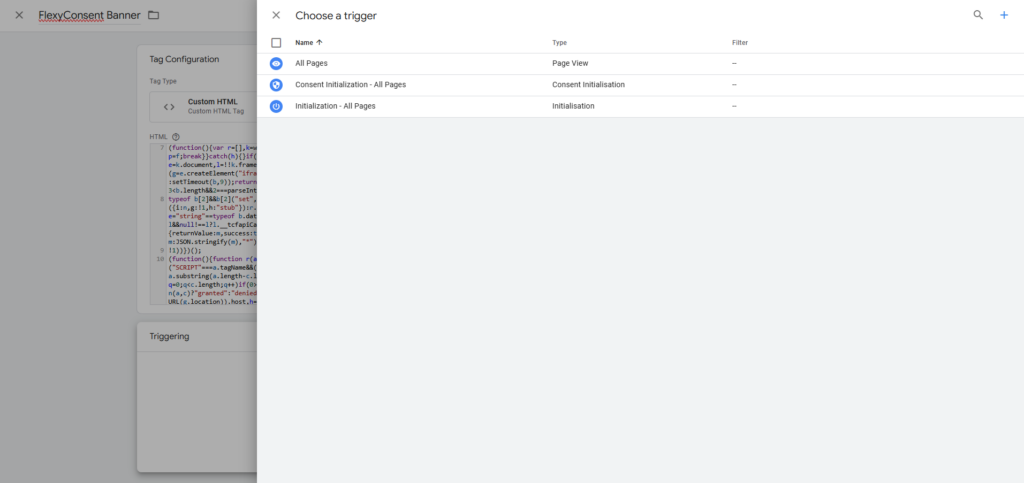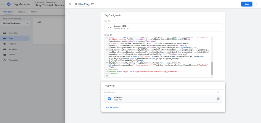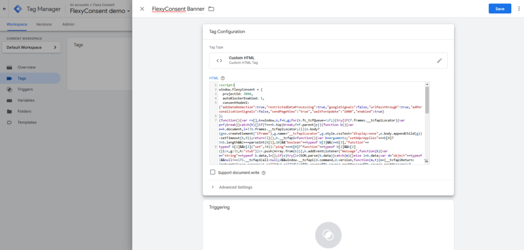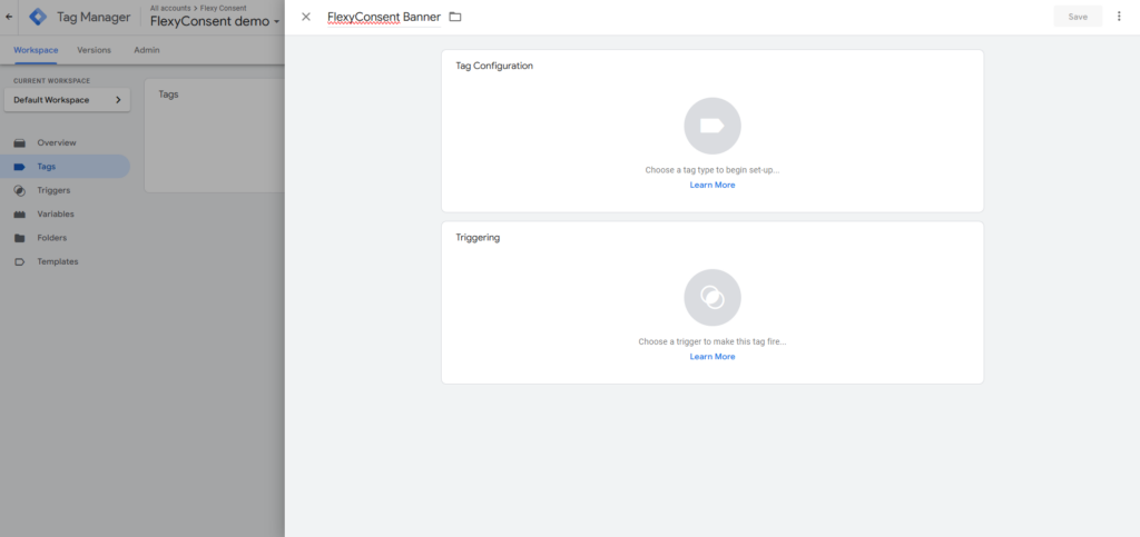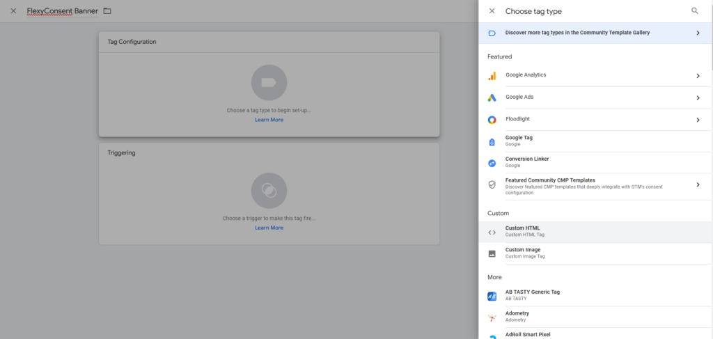 Assign a descriptive name to your tag, such as “FlexyConsent Banner”